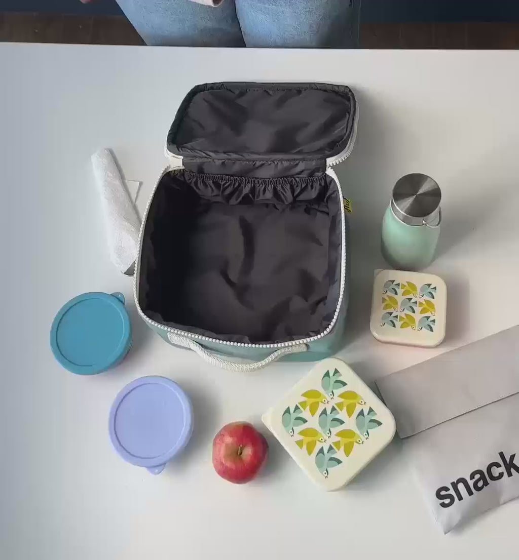 Spacious lunch box with a clean, structured shape and light insulation to help keep food cool. Made from durable, GOTS-certified organic cotton with a rinseable, food-safe lining to contain light spills. Includes a small interior pocket for cutlery or extra organization. Fully machine washable, non-toxic, and ethically handmade with organic and recycled materials.